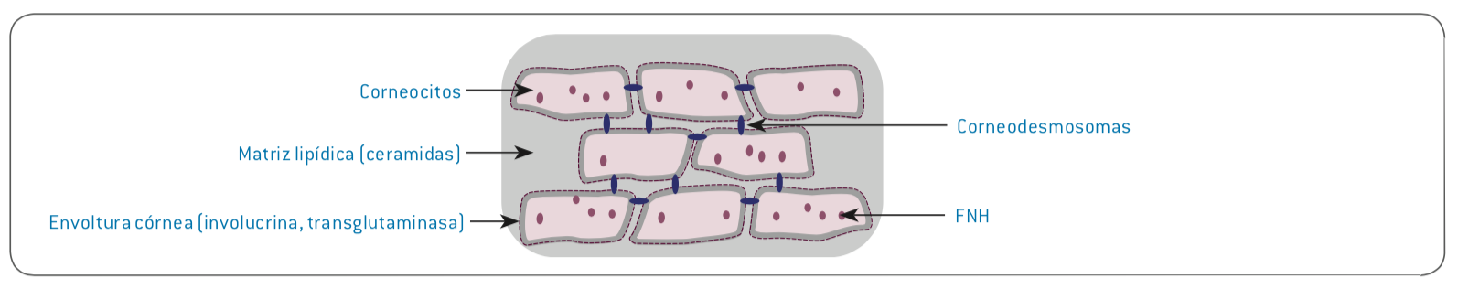 - Cemento lipídico, Compuesto equimolar de ceramidas (40 al 50% de peso total), colesterol (20-25%) y ácidos grasos libres (10-20%), juegan un rol para mantener las células juntas. Se ha establecido claramente que la estructura de los corneocitos y la organización de la bicapa lipídica, constituye una barrera dinámica más compleja que una simple pared de ladrillo.