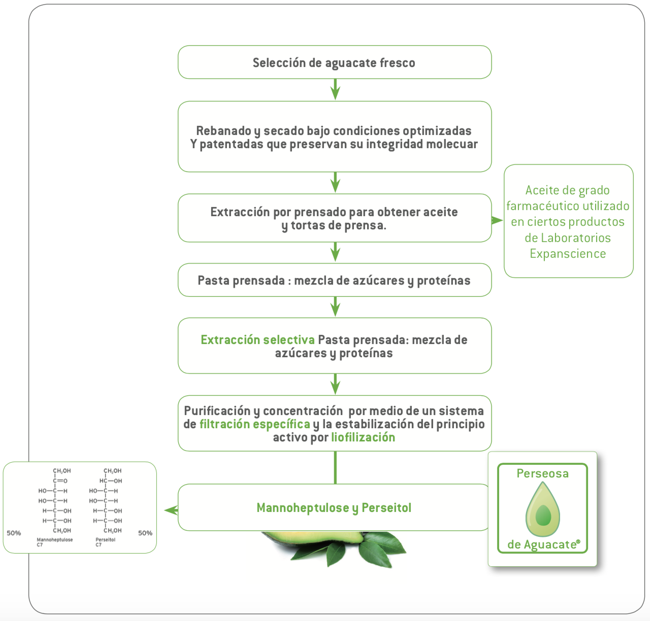 Especialistas en el uso de productos de origen natural, y debido a los amplios conocimientos sobre la química del aguacate, que se ha desarrollado a lo largo de los últimos treinta años, los Laboratorios Expanscience ahora pueden utilizar cada parte de la fruta para producir una docena de materias primas o ingredientes cosméticos activos, incluyendo la Perseosa de Aguacate®.