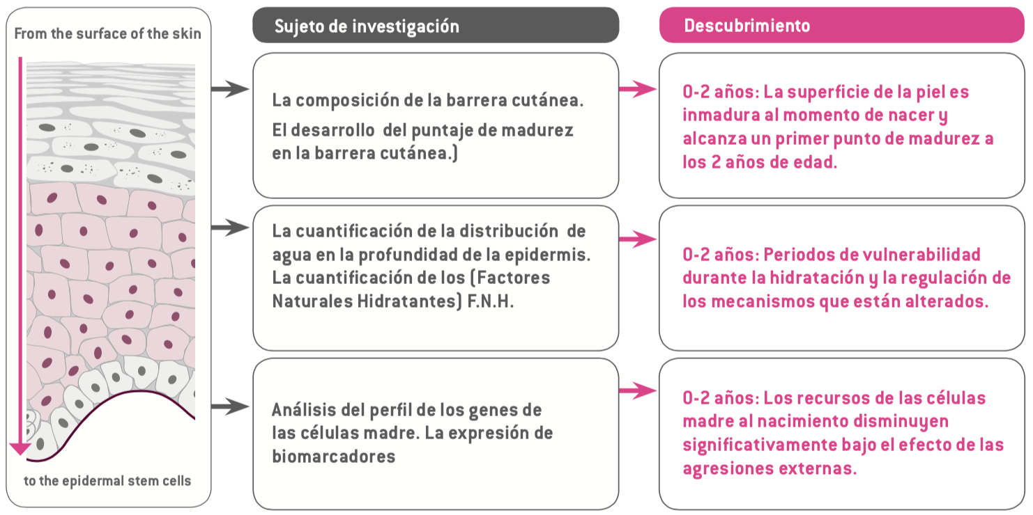 Estos diferentes estudios de la piel de los bebés de diversas edades, comenzando desde el nacimiento, en las células madre que se encuentran en la superficie de la epidermis, nos han permitido encontrar 3 grandes descubrimientos.